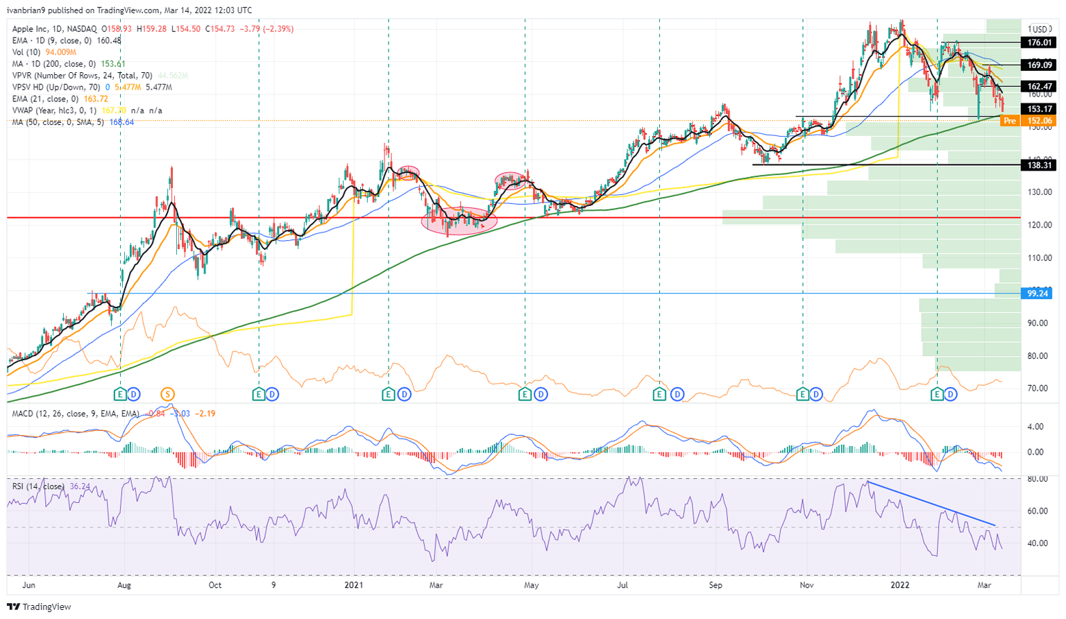 Apple's stock (AAPL) closed lower on Friday as initial optimism on peace talks was quickly washed away by reports of an escalation of the Russian conflict in Ukraine. The market closed lower for the Nasdaq and S&P 500, and most sectors were dragged lower. Apple was not immune to the selling pressure.
