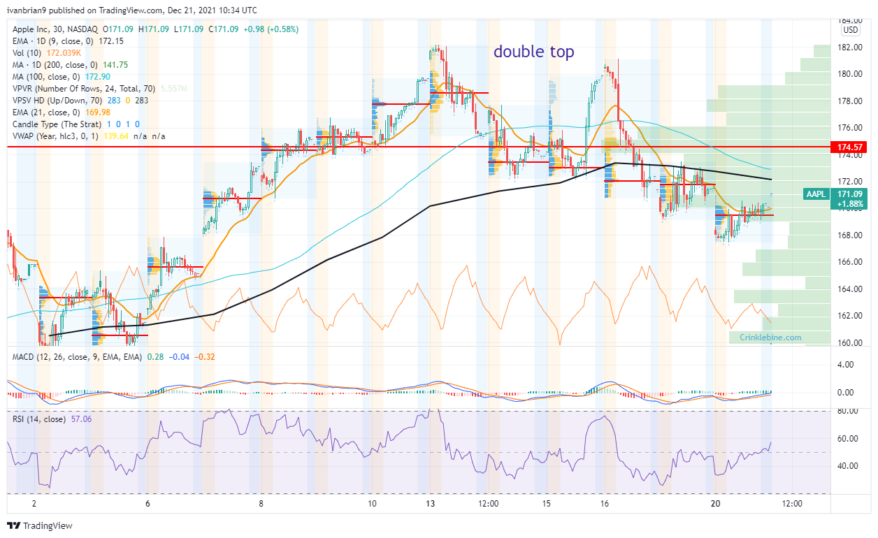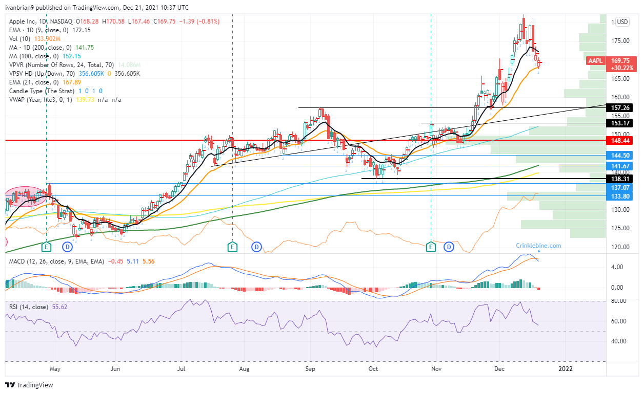 Apple stock fell 0.8% on Tuesday as broad-based selling hit equity markets. The breadth indicators were at least consistent with only 78 stocks in total on the day finishing in the green. Fears had been ongoing late last week about the new Omicron variant. Senator Joe Manchin then put the boot into equities on Sunday when he said he could not back President Biden's Build Back Better plan. This plan is key for Biden but also significant for US GDP growth. In fact, it is so important that Goldman Sachs issued a note on Sunday evening revising down their forecasts for US GDP on the back of Manchin's comments. This then was the perfect storm for equities, and they fell sharply on Monday. News from Europe was not good with Omicron-enforced lockdowns becoming widespread.