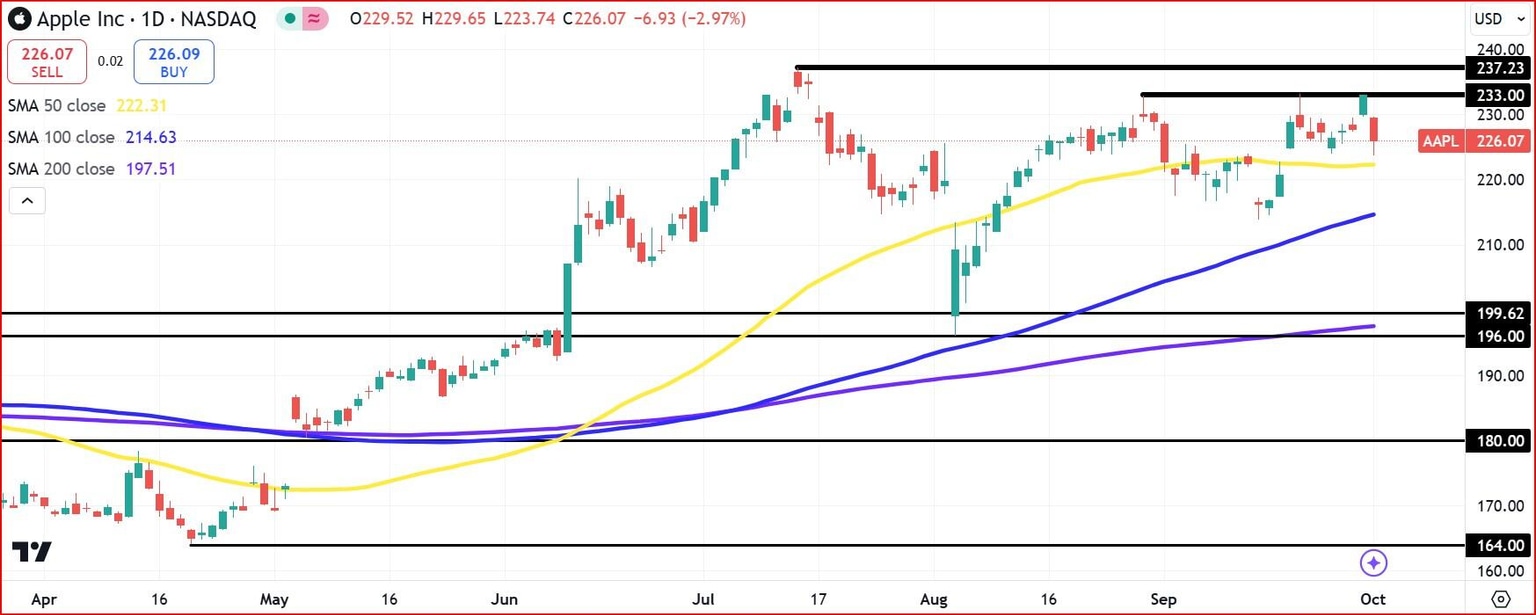Apple stock has recently discovered resistance at the $233 level. On Monday, its advance halted there for the third time. Now it seems likely that this is a signal to sell in the short term. AAPL will need to attempt to hold onto either the 50-day Simple Moving Average (SMA) near $222 or the 100-day SMA at $214. The 200-day SMA is lower down in the chart, trending near a few other historical points of support at $197.50.