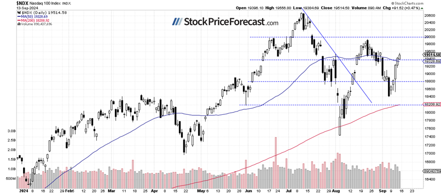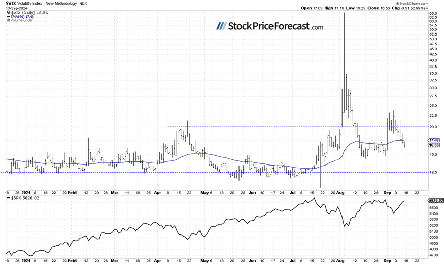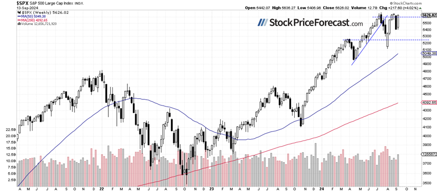 In my Stock Price Forecast for September 2024, I noted that, “the market experienced significant volatility in August, with a roller-coaster ride that included a sell-off to the August 5 local low and a subsequent advance, leading to a consolidation near the record high. (…) sharp reversal suggests more volatility in September. Last month, I wrote that ‘August is beginning on a very bearish note, but the market may find a local bottom at some point.’ The same could be said today, and September will likely not be entirely bearish for stocks.”