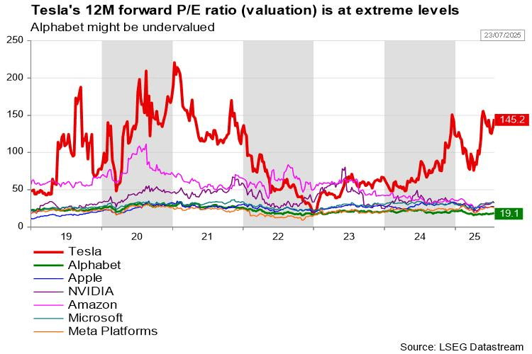 However, headlines on the trade front may overshadow the market impact of earnings. Global economies face a two-week deadline, until August 1, to reach an agreement with the U.S. administration or risk facing harsh tariffs. Still, since services are not directly targeted by the tariffs, Alphabet’s results may lead to greater market volatility.