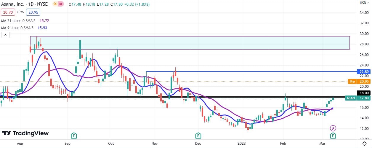 The Asana stock price has broken above the $20.80 resistance level that pushed prices down in October and November of 2022. The 9-day moving average has crossed above the 21-day average, which should convince more traders to take a bet on ASAN stock. Now bulls will have their sights set on the supply zone extending from $27 to $29.50. This area saw many bagholders sell their stashes last fall. Expect the same to happen again once Moskovitz's buying pushes the share price higher. Longer-term support remains at $18.