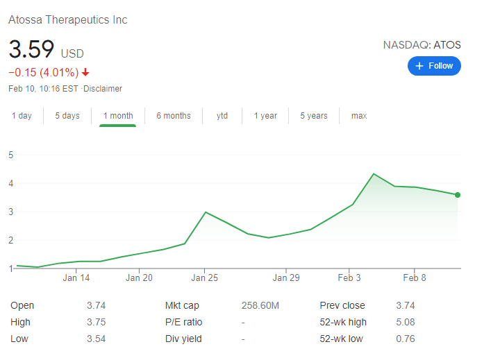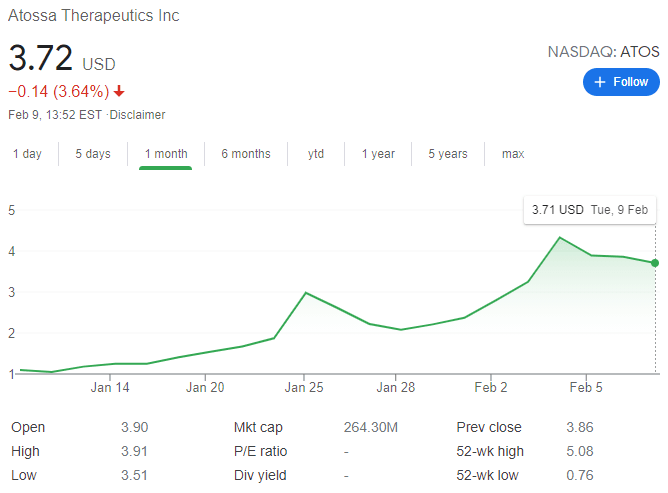 Update Thursday, February 11: NASDAQ: ATOS has been sliding for the fifth consecutive day, changing hands at around $3.38 as of Thursday morning, down from the peak close of $4.33 on a week ago. Shares of the promising Seattle-based pharmaceutical firm have been struggling since their surge in late January and early February when its medical breakthroughs propelled it higher. Atossa Therapeutics Inc may still attract traders later on as bargain-seekers jump on the stock. See all the latest hot stocks news.