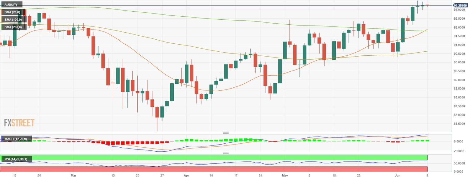 - The AUD/JPY peaked at a daily high of 93.45 on Thursday.