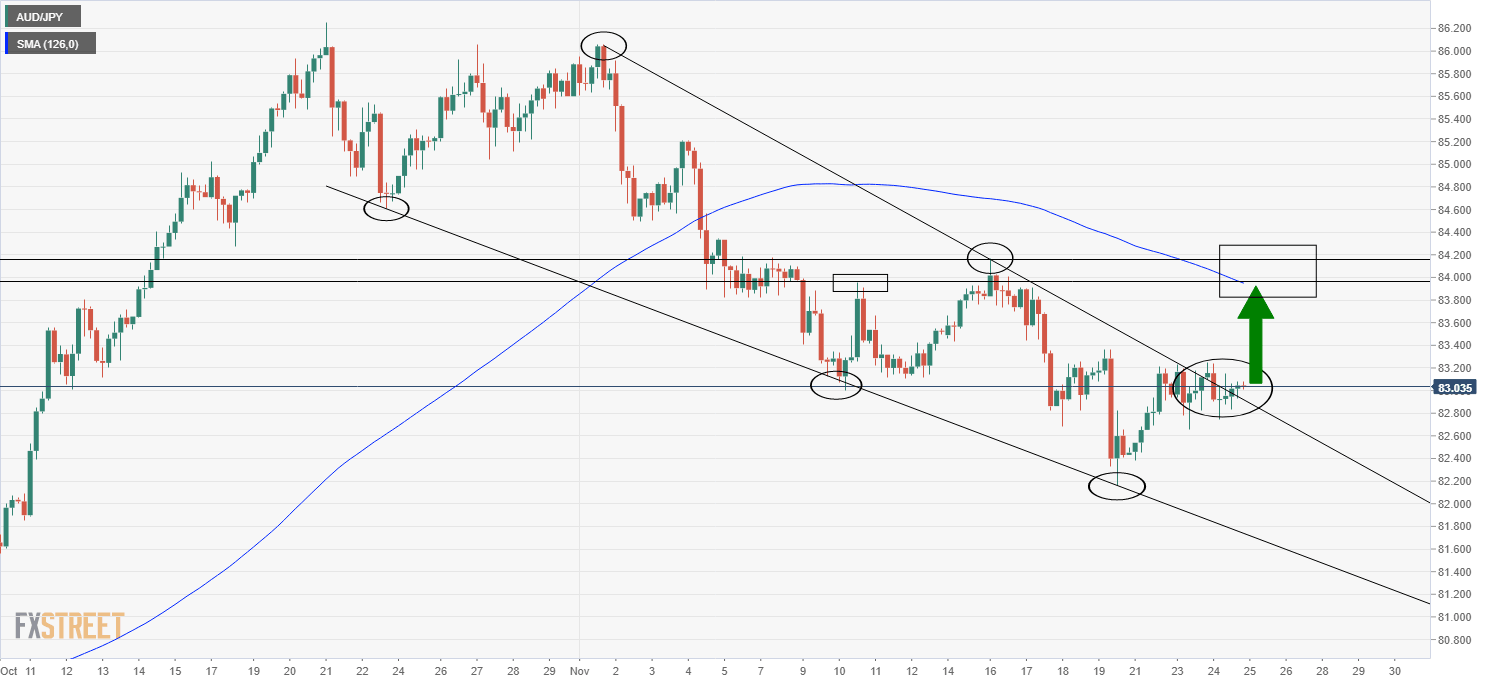 Looking at AUD/JPY over a longer time horizon, the pair may be showing some bullish signs that it is about to break out of a bearish trend channel that has been containing the price action since the start of November. A break to the north would signal a potential move towards the pair’s 21DMA and 15 November highs in the 84.00 area.