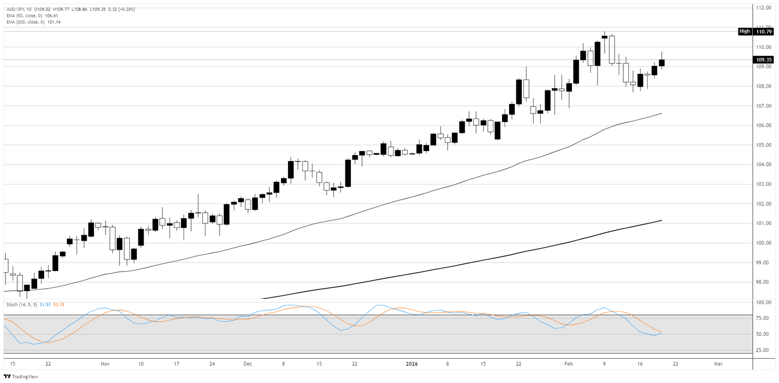 On the daily chart, AUD/JPY traded in a narrow range near 109.00 on Thursday. The pair is holding well above the rising 50-day Exponential Moving Average (EMA) at 106.60 and the 200-day EMA at 100.45, confirming the uptrend from the early January lows near 104.72 is continuing. The rally from those lows has stalled since printing a year-to-date high at 110.79 in early February, with price consolidating in a roughly 109.00 to 110.00 range over the past two weeks. The Stochastic Oscillator has rolled down from the overbought zone and is now drifting near the midline, suggesting momentum has cooled and the pair has room to move in either direction. A cluster of small-bodied candles near 109.00 points to indecision. Resistance sits at the 110.79 high; a break above would open the path toward 112.00. Support rests at 108.00, with the 50-day EMA at 106.60 below.