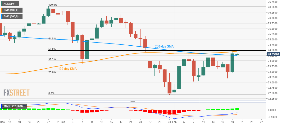 AUD/JPY registers 0.10% gains as trading near 74.33 during the Asian session on Thursday. In doing so, the pair justifies the sustained trading above 200-day SMA and bullish MACD. However, a confluence of 100-day SMA and 50% Fibonacci retracement of December 2019 to January 2020 declines seem a tough nut to crack for the buyers.