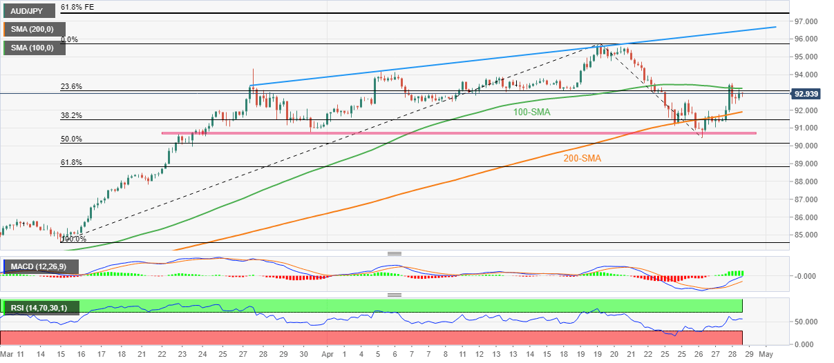 AUD/JPY holds on to the mid-week rebound as buyers battle with the key moving average during Friday’s initial Asian session, up 0.10% near 93.00 by the press time. In doing so, the cross-currency pair pokes the 100-SMA hurdle, around 93.25 at the latest.