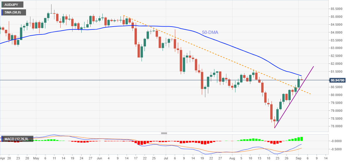 It’s worth noting that the AUD/JPY sellers remain cautious until the prices stay above an ascending support line from August 20 and a bit broader resistance-turned-support line, respectively near 80.60 and 80.30. Also challenging the pair bears is the 80.00 threshold.