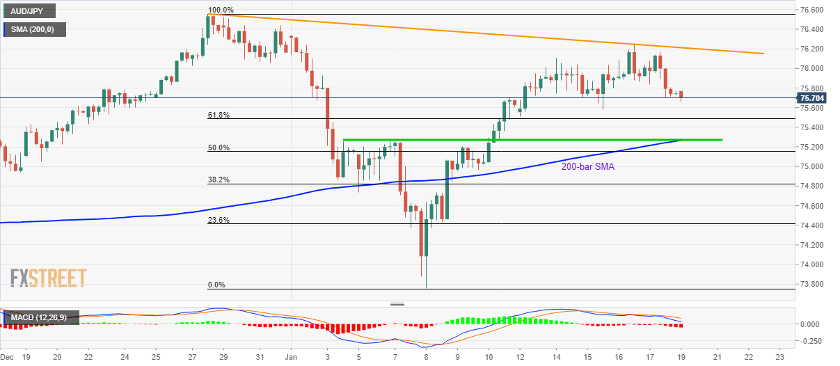 AUD/JPY declines to 75.70 during the initial Asian session on Monday. That said, the pair has been weaker since taking a U-turn from 76.25 on late-Thursday. The sellers also cheer bearish signals from the 12-bar MACD indicator.