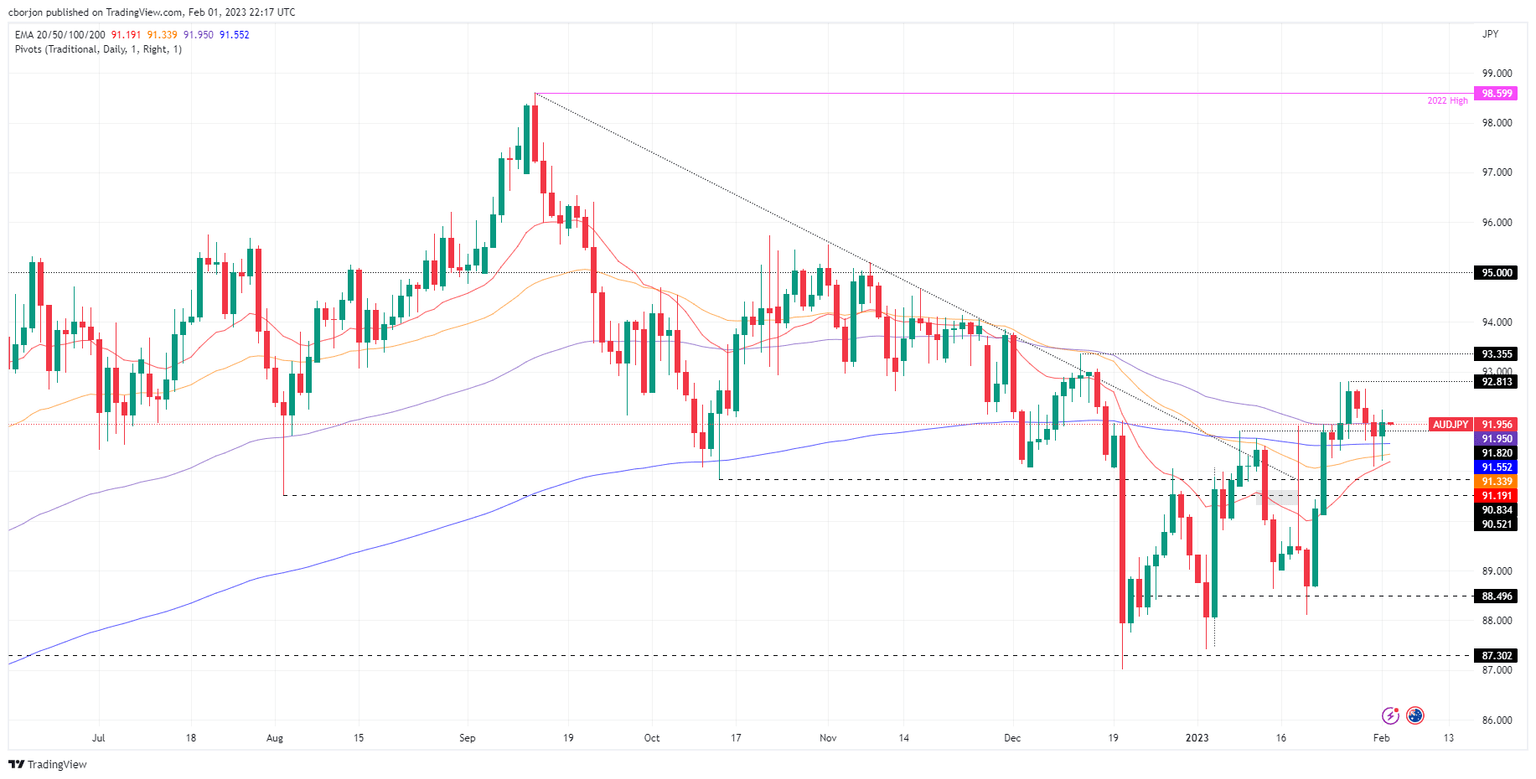 - The AUD/JPY cleared the 50/200/100-day Exponential Moving Averages (EMAs) on its way to 92.20s.