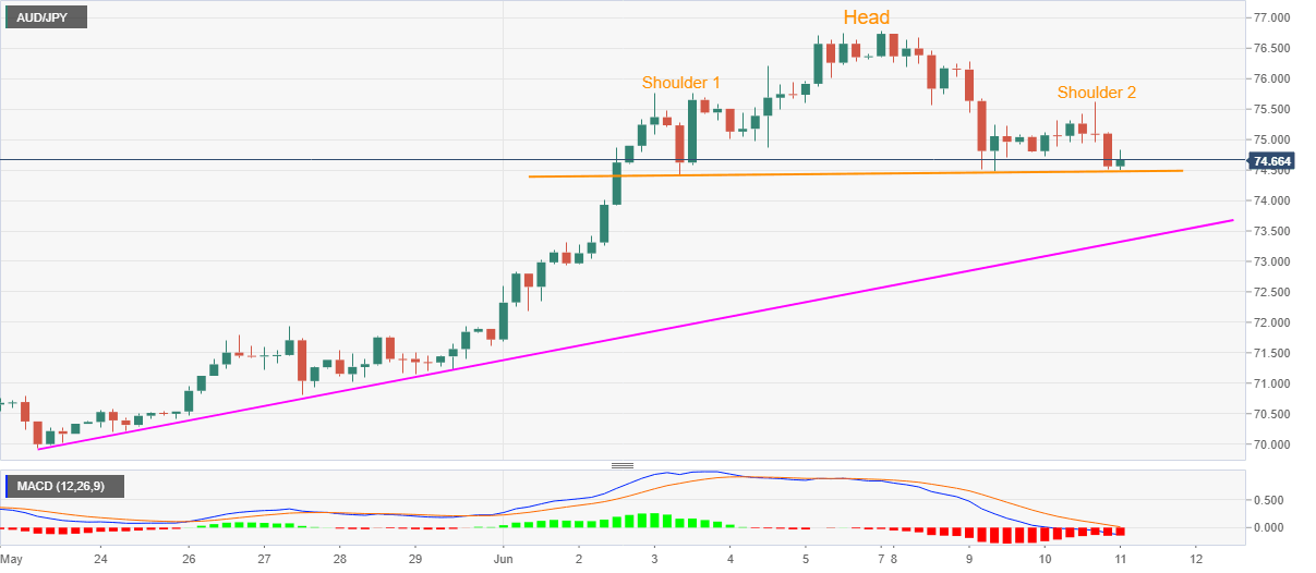 AUD/JPY drops to 74.60, down 0.47% on a day, during the early Thursday. In doing so, the pair rests near the neckline of a short-term Head-and-Shoulders bearish formation on the 4-hour chart.