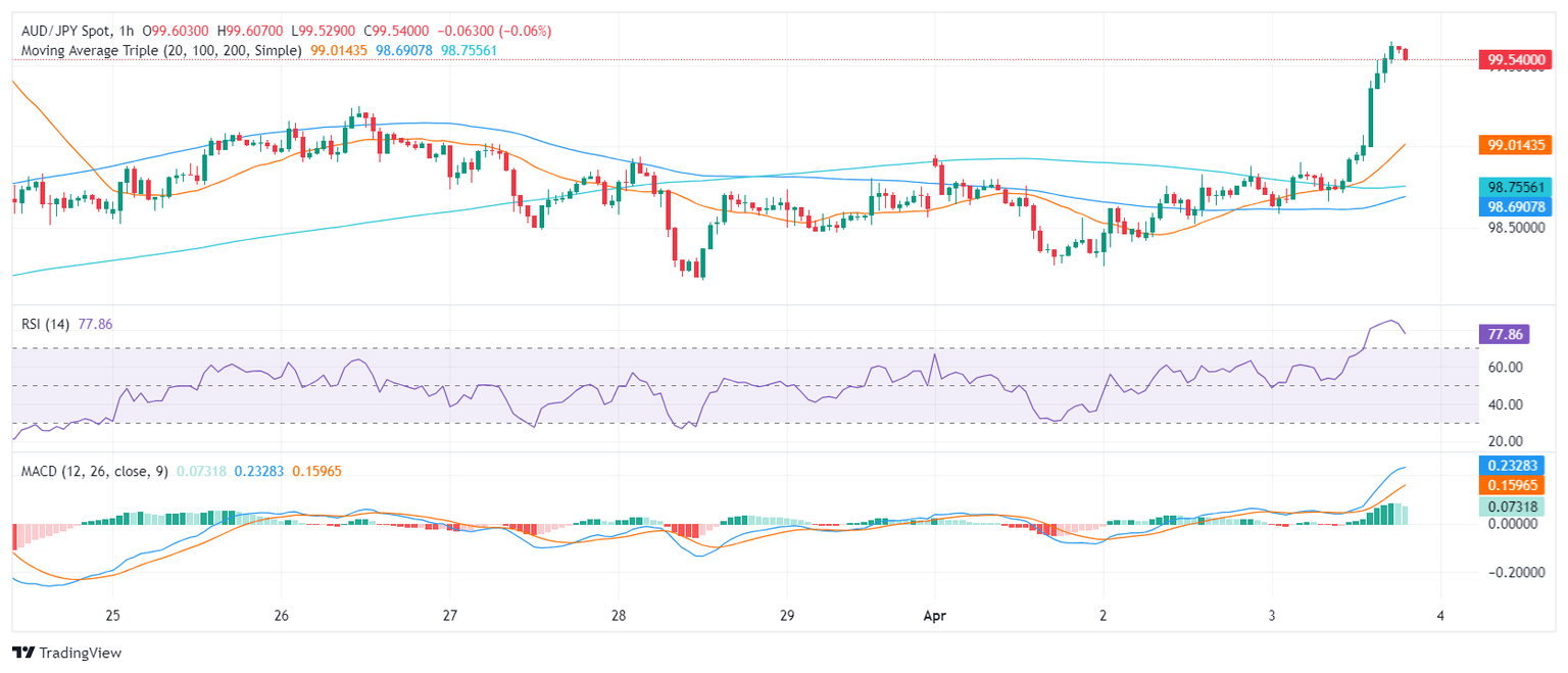 In Wednesday's session, the AUD/JPY pair is trading at 99.58, following an increase of 0.82%. Buyers appear in control, but indicators are flashing signals of a short-term consolidation.