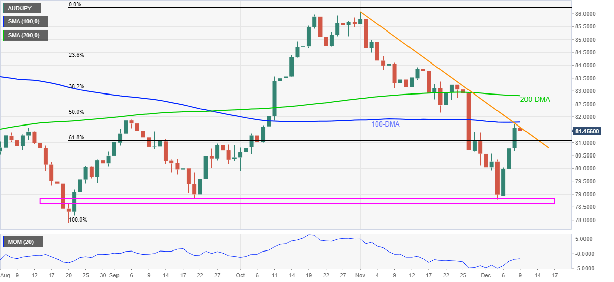 AUD/JPY wavers around 81.50, despite the latest rebound from intraday low, during early Thursday.