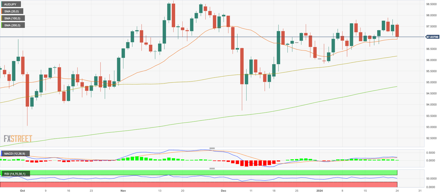 - AUD/JPY trades at 97.12 with 0.40% losses.