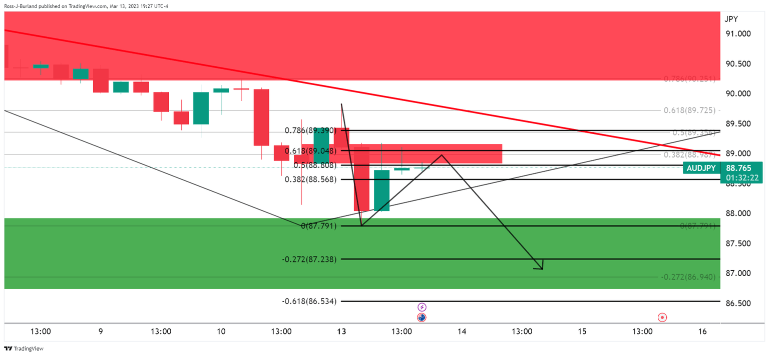 AUD/JPY is flat on the day so far approaching the Tokyo open, trading at 88.67 and sticking to a 20 pip range so far. The bulls are stepping in from daily support with prospects of a bullish correction towards prior support that would now be regarded as resistance. Pulling up the Fibonacci scale, there is an alignment with the 78.6% Fibonacci resistance near to 90.25: