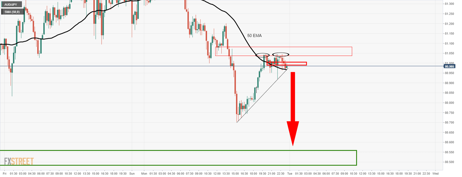 - AUD/JPY 15-min double top opens risk of a break below the 50-EMA.
