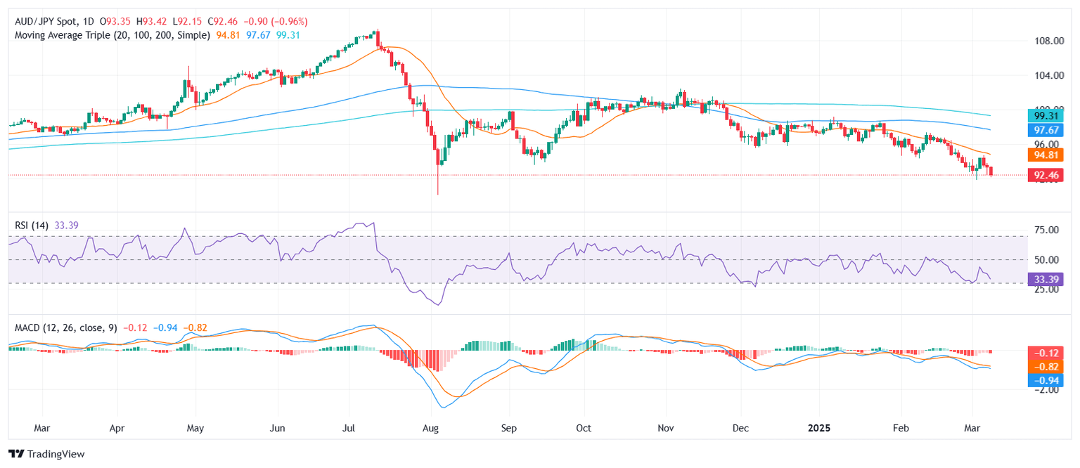 The AUD/JPY pair extended its decline on Monday ahead of the Asian session, falling toward the 92.50 zone and marking a third straight day of losses. The downward momentum remains strong as the pair struggles to maintain levels above 93.00, with bearish sentiment prevailing in the short term. Risk-off flows and weak demand for the Australian Dollar continue to weigh on the pair.