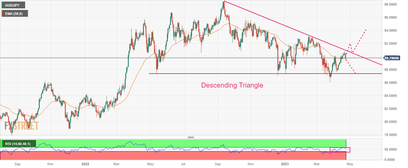 The AUD/JPY pair is oscillating around 89.80 in the Asian session. The risk barometer is showing a lackluster performance despite novel Bank of Japan (BoJ) Governor Kazuo Ueda saying, “Japan's consumer inflation, including index stripping away fuel costs, likely nearing its peak,” adding that he is “seeing it slowing ahead.” BoJ Ueda has reiterated the need of keeping monetary policy expansionary ahead.