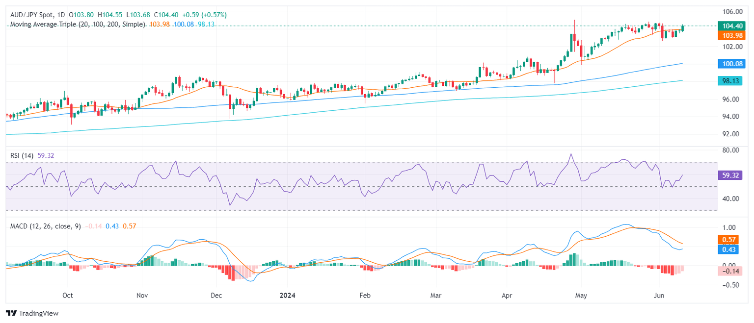 In Wednesday's session, the AUD/JPY pair exhibited a promising move, surpassing the 20-day Simple Moving Average (SMA) at 103.90. This could be a positive sign, demonstrating strength in the Australian Dollar against its competitors. However, the ongoing consolidation phase suggests that there may not be enough momentum for a persistent rise.