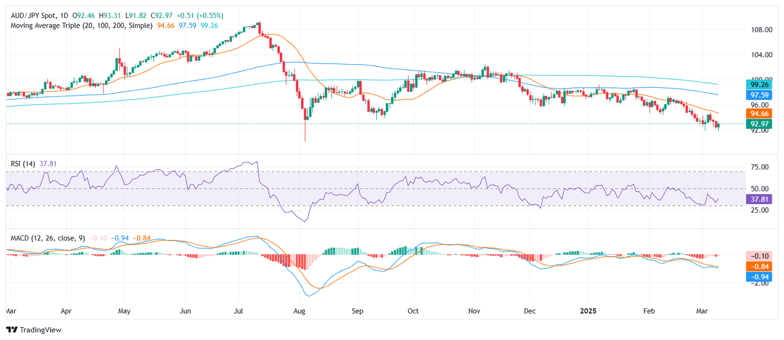 The AUD/JPY pair bounced back on Tuesday ahead of the Asian session, moving near the 93.00 zone after declining for three consecutive sessions. While the daily advance suggests some buying pressure, the broader technical picture remains uncertain as the pair struggles to hold above key resistance levels.