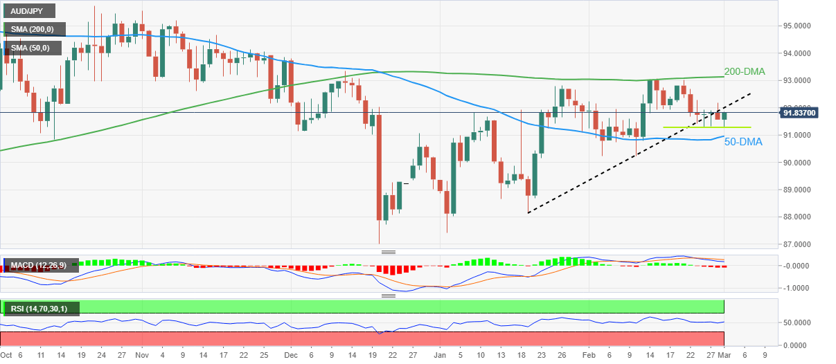 AUD/JPY Price Analysis: China PMI-led rebound approaches 92.00 support-turned-resistance