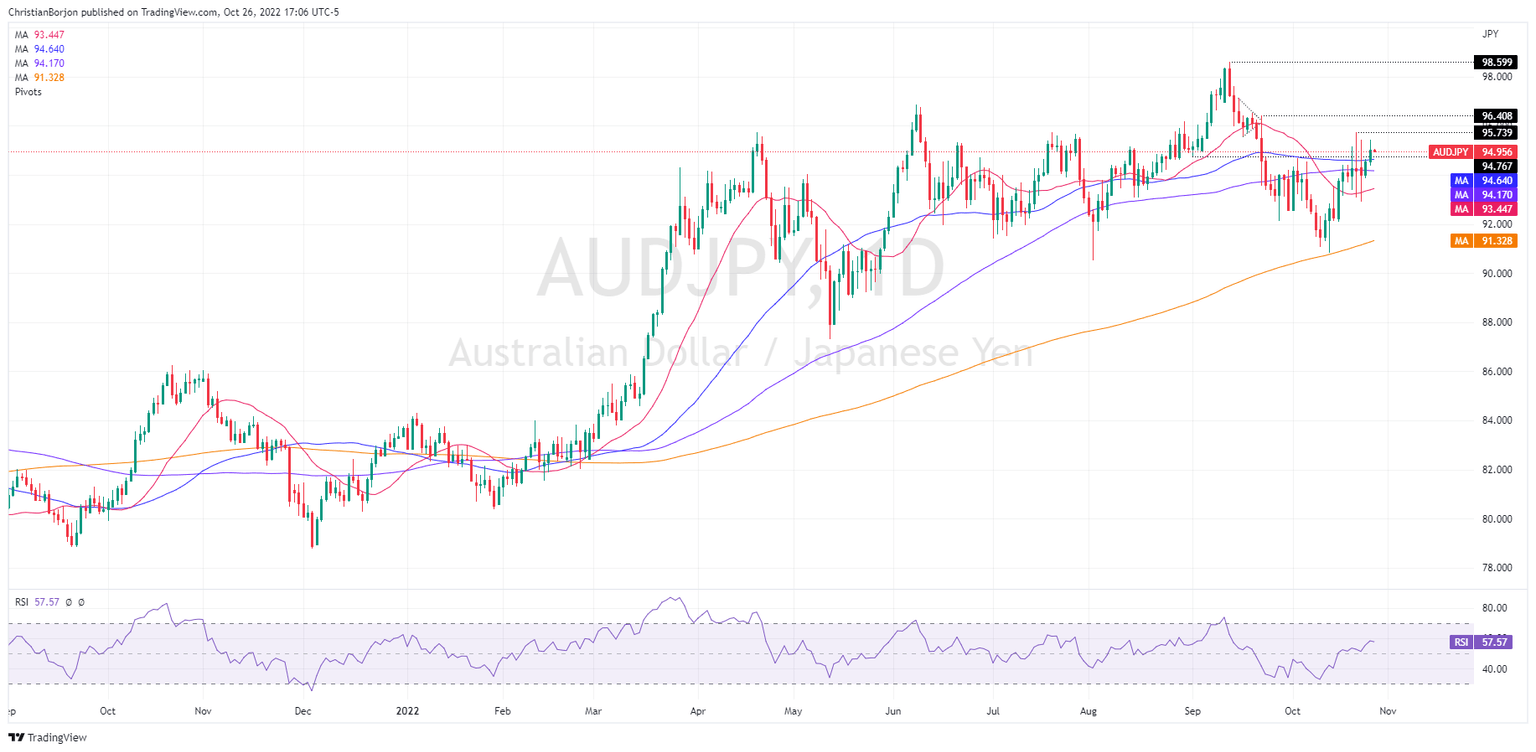 - The AUD/JPY daily chart is upward-biased, and if it clears 95.44, a retest of 96.40 is on the cards, ahead f the YTD high at 98.60.