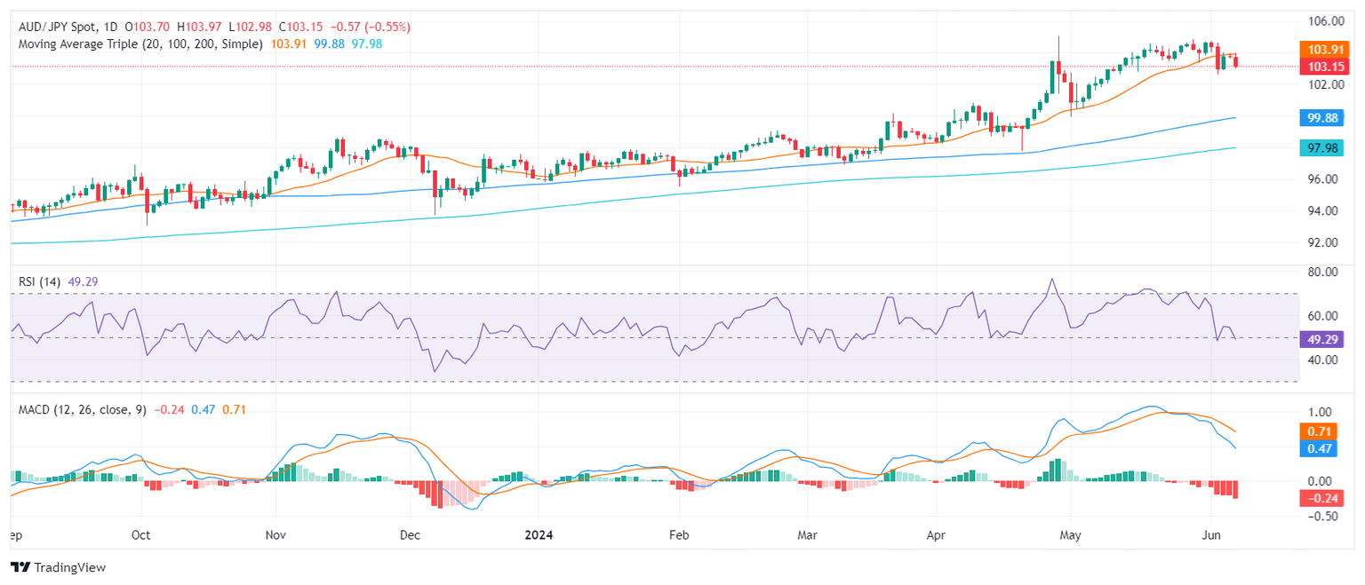 During the last trading sessions of this week, the AUD/JPY pair is maneuvering around the 103.00 level. This is indicative of an ongoing consolidation period following the impressive rally since early May.