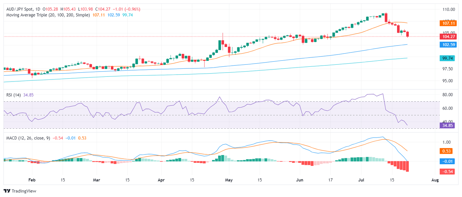 In Monday's trading, the AUD/JPY pair has continued its downward trend, declining by more than 0.90% to touch 104.30. This substantiates the dominance of the bears and magnifies the prevailing negative short-term outlook as the pair reaches new lows.