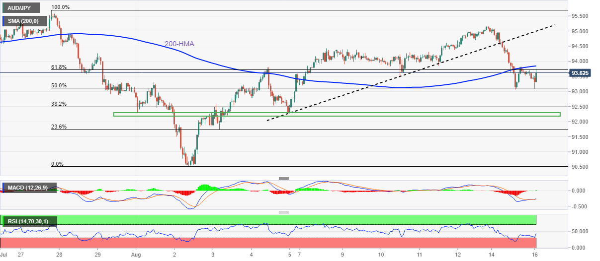 However, the 200-HMA level surrounding 93.85 restricts the immediate upside of the AUD/JPY pair ahead of the previous support line from August 05, close to the 95.00 threshold at the latest.