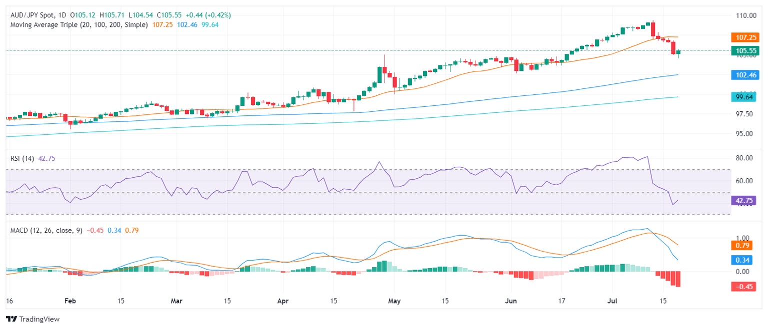In Thursday's session, the AUD/JPY pair cut a significant five-day losing streak, climbing by 0.30% to reach 105.50. This rise is symbolically indicative of an interruption to the extended bearish momentum experienced by the pair seen in the last sessions. Even so, indicator readings are still stationed in the negatives, creating the possibility for the pair's upward correction to be rather more corrective in nature.
