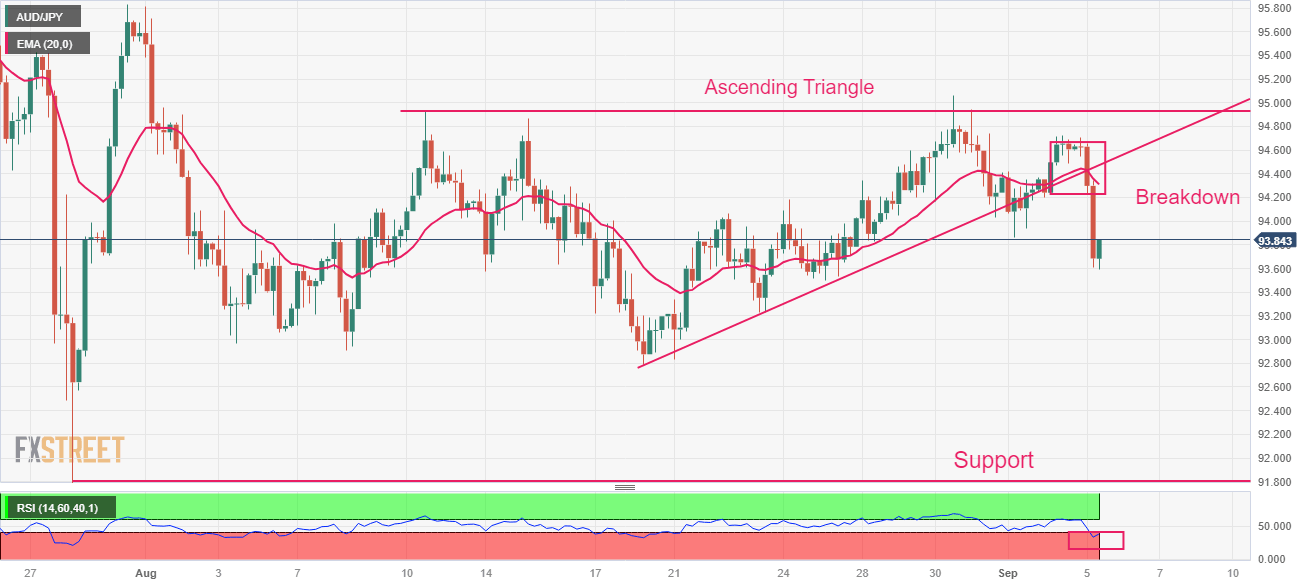 AUD/JPY delivers a breakdown of the Ascending Triangle chart pattern formed on a four-hour scale, which opens the door for a fresh downside. For the time being, the asset is expected to remain well-supported above the horizontal support plotted from July 21 low at $91.79. The 20-period Exponential Moving Average (EMA) at $94.30 continues to act as a barricade for the Australian Dollar bulls.