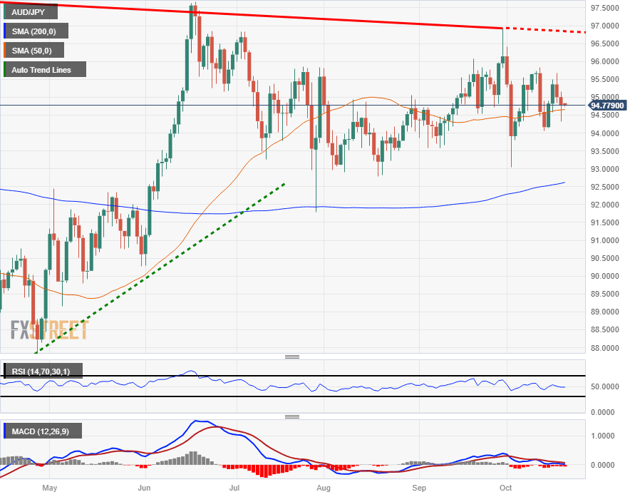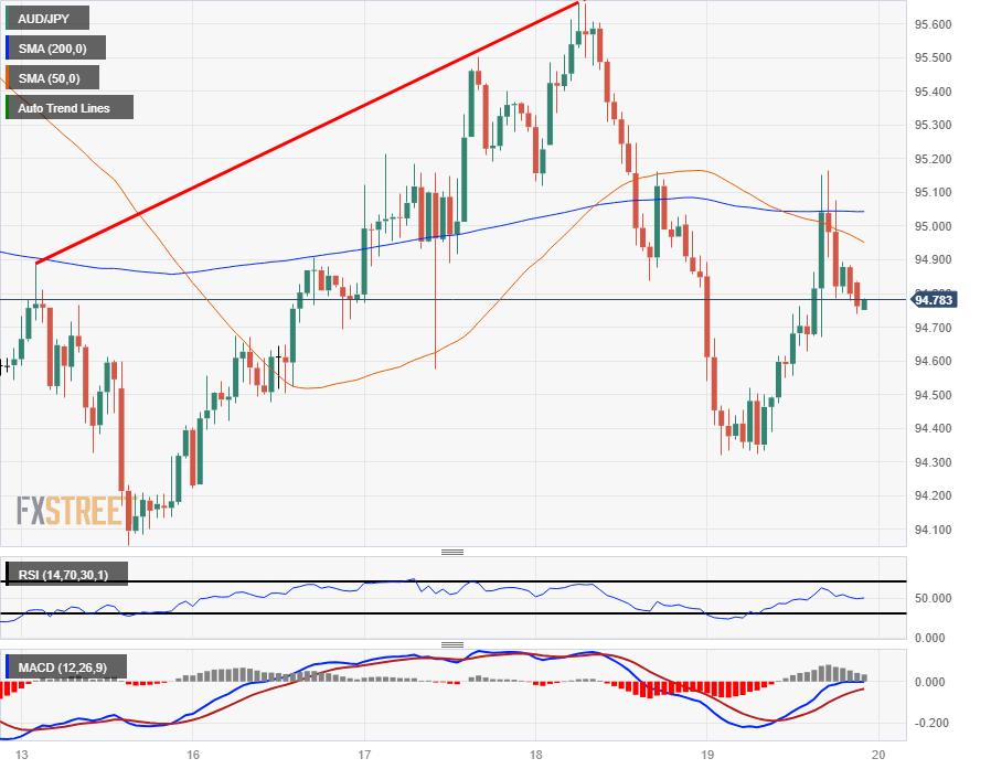 The AUD/JPY kicked off Thursday trading at 94.85 before dropping into an early low of 94.31. The Aussie (AUD) then rallied against the Japanese Yen (JPY), ticking into 95.16 before seeing an intraday rejection of the 200-hour Simple Moving Average (SMA) near 95.05.