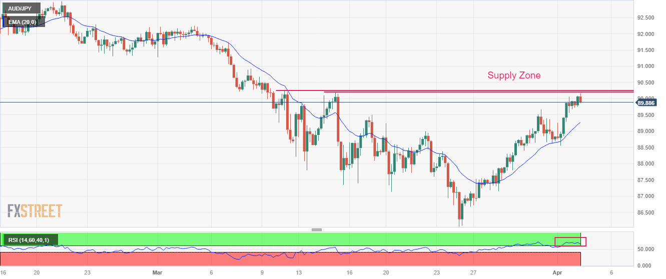 On a four-hour scale, AUD/JPY has sensed selling pressure after reaching near the supply zone placed in a narrow range of 90.19-90.25, around March 15 high. The selling pressure in the Australian Dollar is inspired by steady RBA monetary policy. The 20-period Exponential Moving Average (EMA) at 89.13 is scaling higher, which indicates that the short-term trend is bullish.