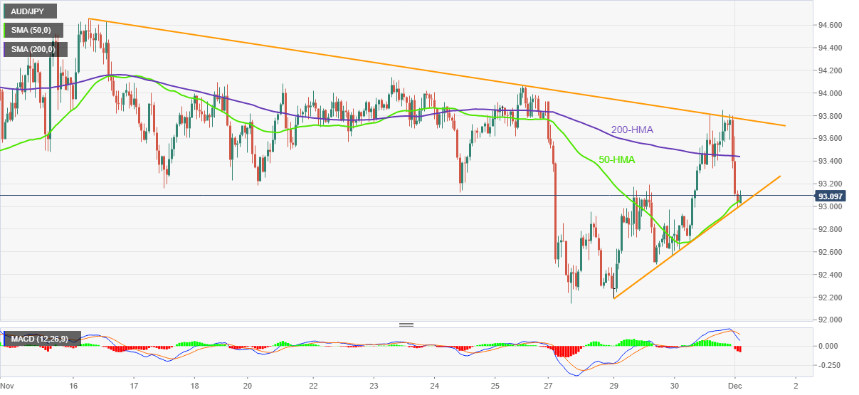 In addition to the data, the cross-currency pair’s downside break of the 200-HMA, around 93.45 by the press time, also keeps the AUD/JPY bears hopeful, not to forget the bearish MACD signals and a U-turn from the fortnight-long resistance line.