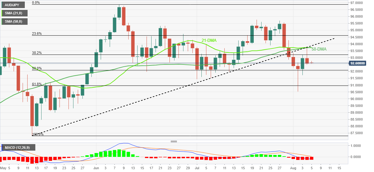 However, the 50% Fibonacci retracement level of May-June upside, around 92.10, quickly followed by the 92.00 threshold, could challenge the AUD/JPY sellers.
