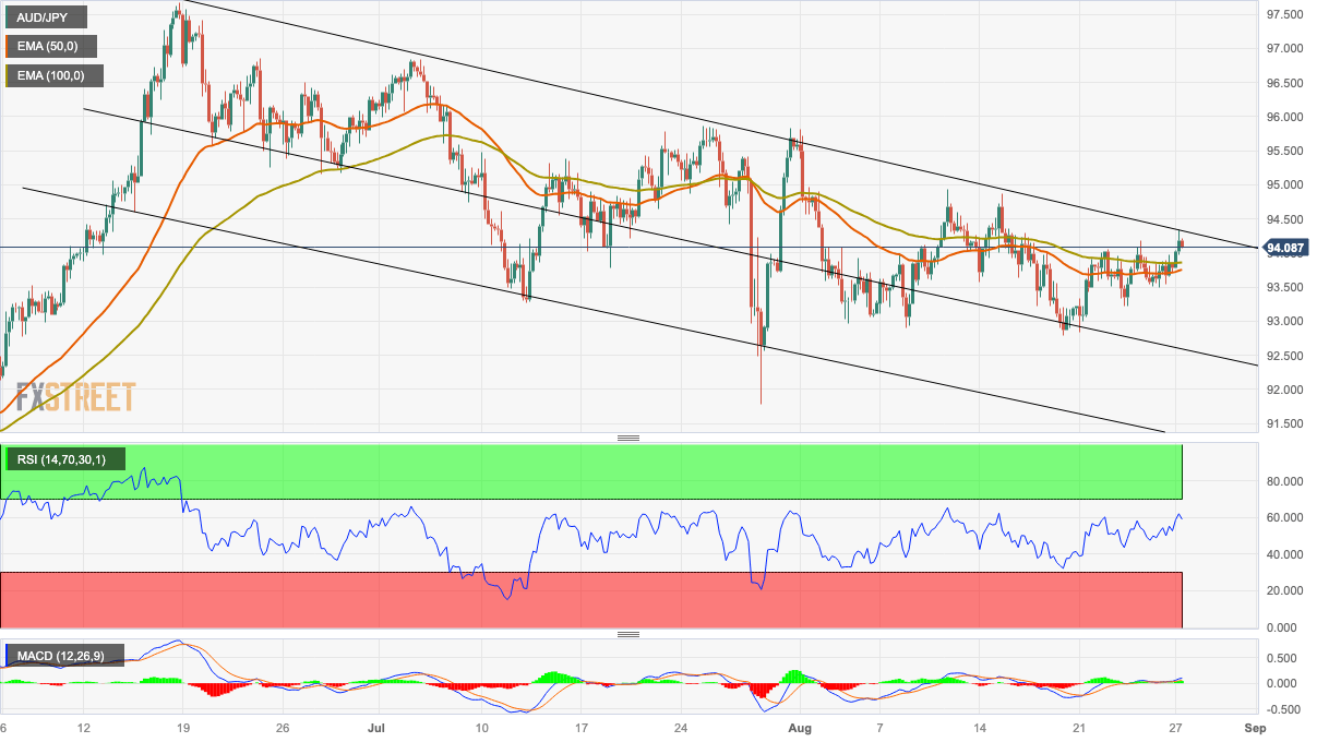 The AUD/JPY cross edges higher above the 94.00 mark during the early European session on Monday. The Chinese finance ministry said on Sunday that the authorities would reduce the 0.1% duty on stock trading to stimulate the capital market and strengthen investor confidence. This development triggers a risk-on mood and boosts the China-proxy Australian Dollar against the Japanese Yen.