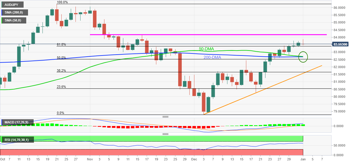 AUD/JPY eases after refreshing multi-day top, down 0.10% intraday around 83.55 during early Monday morning in Europe.