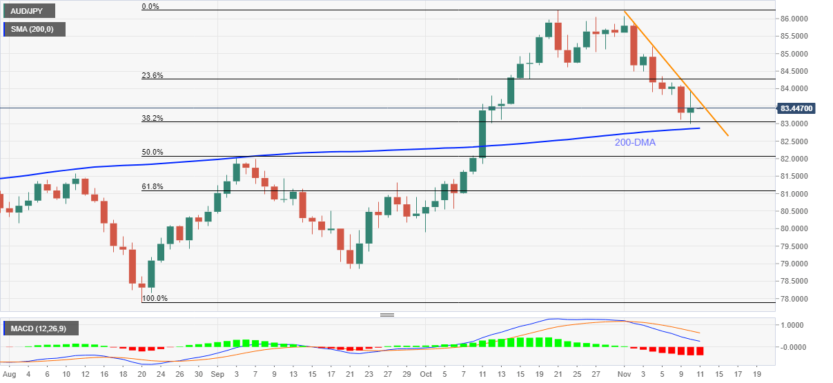 AUD/JPY remains on the back foot around a one-month low, close to 83.45 amid the initial Asian session with a key Thursday comprising the Aussie jobs report for October.