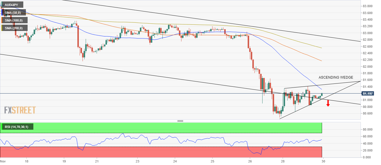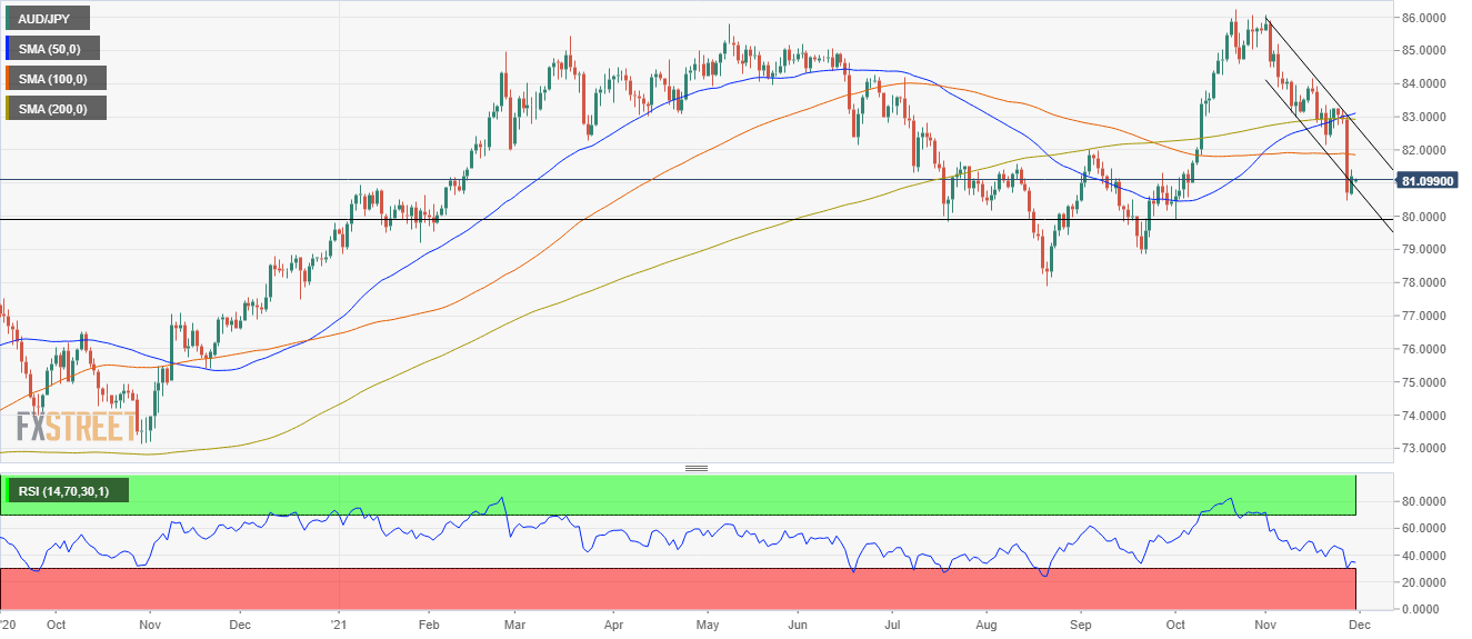 - AUD/JPY daily and hourly charts are tilted to the downside.
