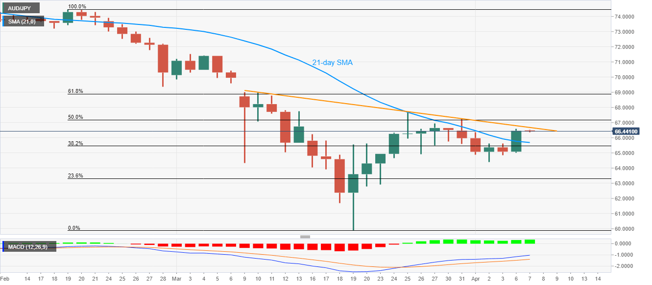 Despite trading in a range between 66.35 and 66.55 since Monday’s US session, currently around 66.30, AUD/JPY remains mildly on the back foot, down 0.10%, amid the early Tuesday morning in Asia.