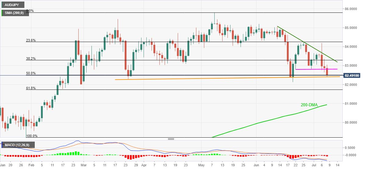 AUD/JPY takes offers around 82.43, down 0.52% intraday, amid Thursday’s Asian session. In doing so, the cross-currency pair drops to the fresh low since June 21 as sellers attack an ascending support line from March 24.