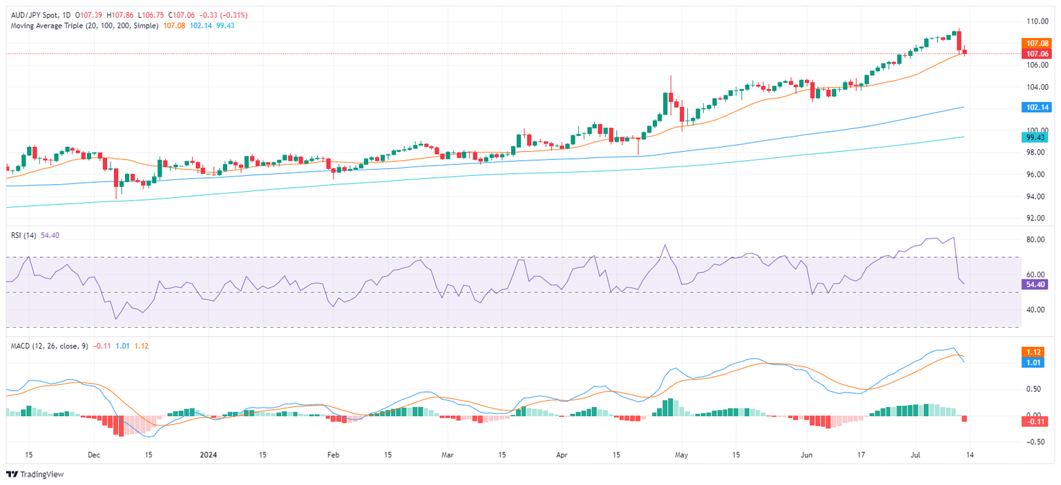 - AUD/JPY declines to 107.10 while holding just above the 20-day SMA support.