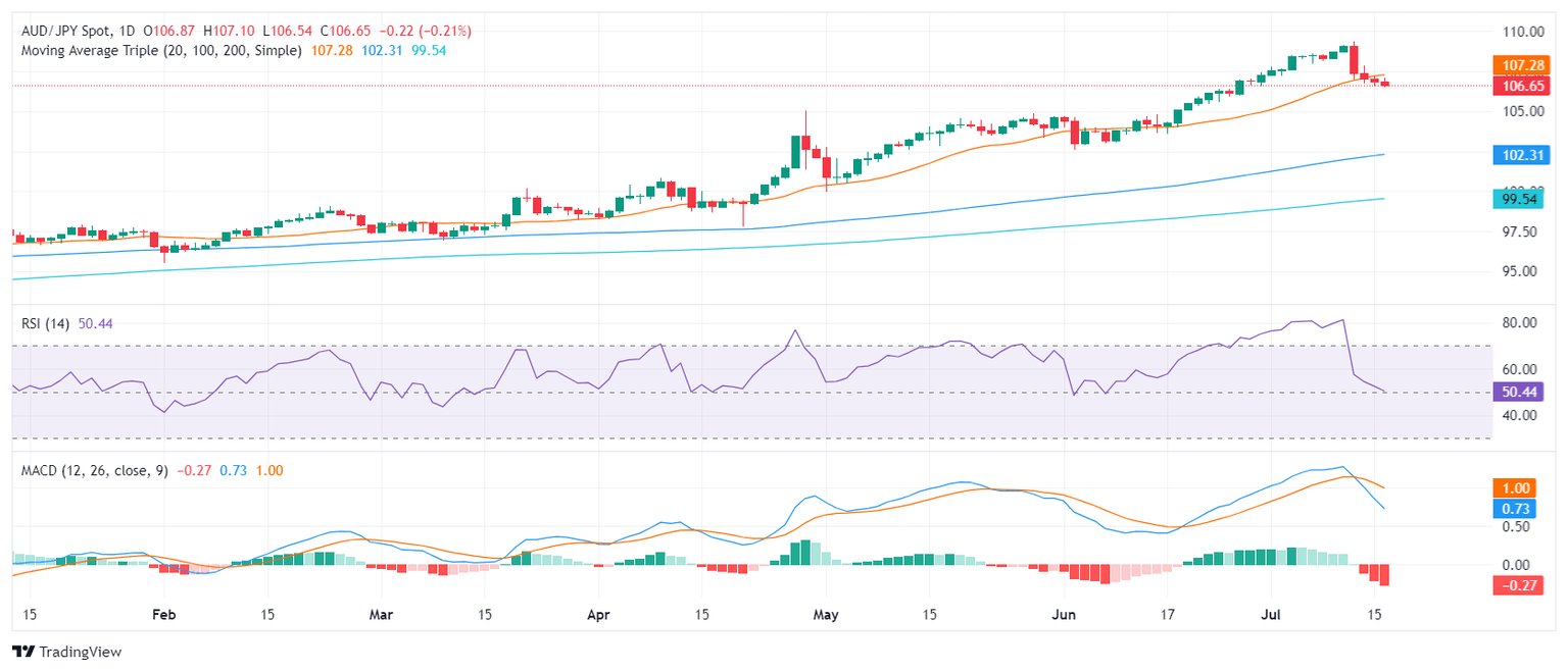 Taking a wider view, the AUD/JPY pair seems to maintain a bearish tendency, further accentuated by its position below the 20-day Simple Moving Average (SMA) support. Should the downward movement proceed, the immediate support levels at 106.50 and 106.00 remain the critical markers to watch. On the flip side, to limit further potential losses, buyers should aim to retrieve the 107.00 level, the 107.30 zone (20-day SMA), and then target the 108.00 barrier as a signal for recovery.