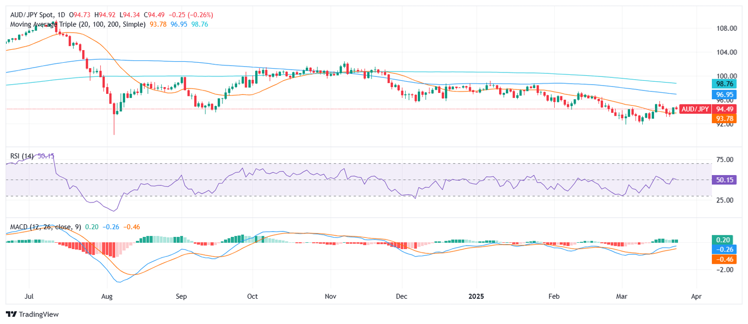 The AUD/JPY pair was seen around the 94.40 zone after the European session on Tuesday, registering a mild decline and sitting roughly at the midpoint of the day’s trading range. While short-term moving averages and some momentum tools lean bullish, longer-term trend signals and broader oscillators suggest that the pair is locked in a neutral stance heading into the Asian session.