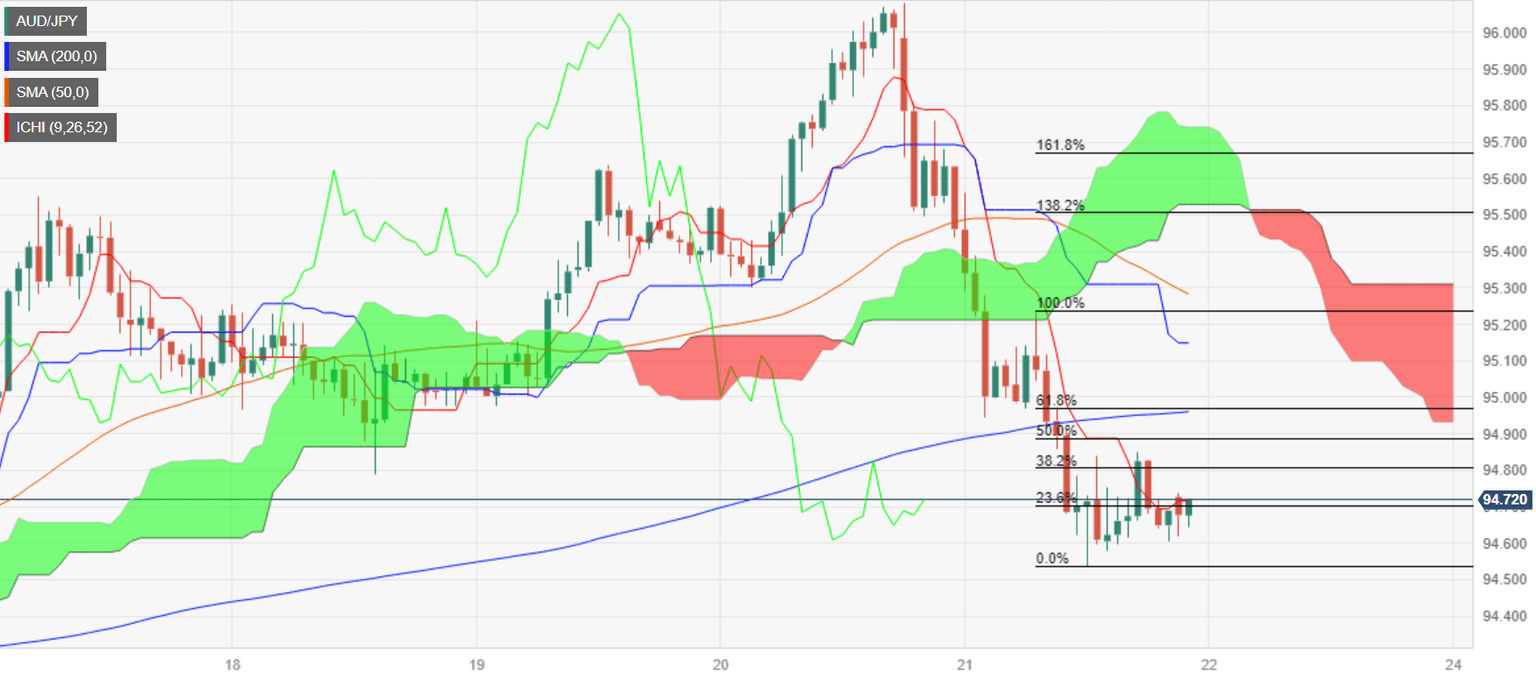- AUD/JPY retraces from 96.06 to 94.67, influenced by central banks' focus on high inflation and a sour market mood.