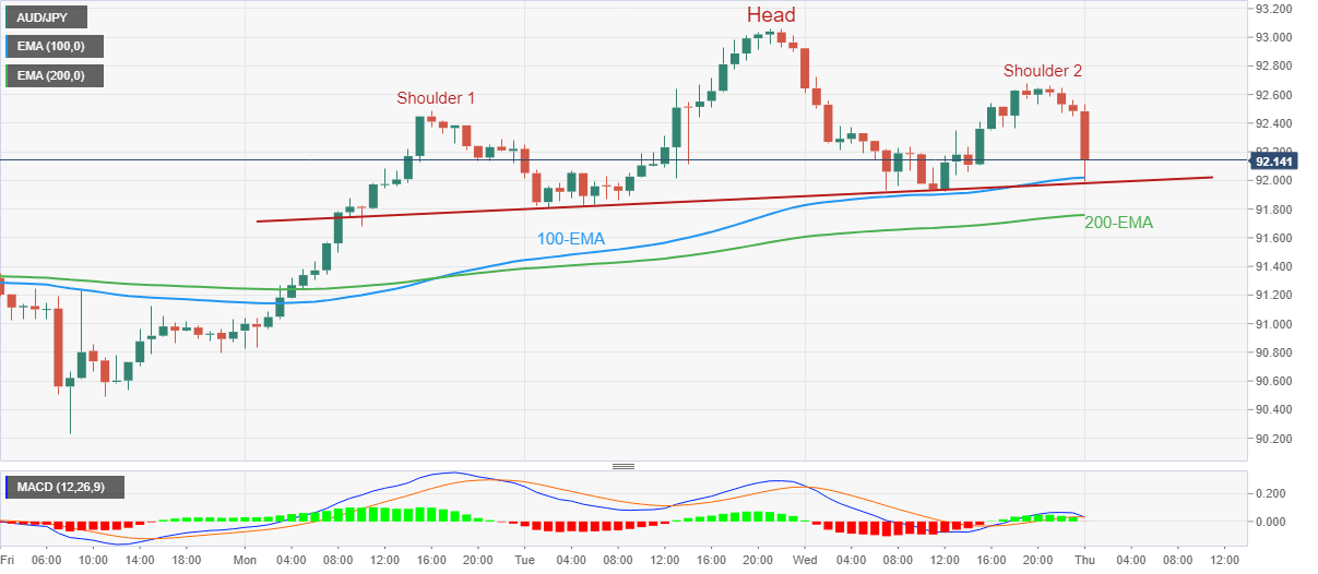 AUD/JPY lures sellers with an interesting head-and-shoulders bearish chart pattern following the downbeat prints of Australia’s inflation and employment numbers during early Thursday. That said, the cross-currency pair dropped nearly 50 pips to refresh an intraday low of around 92.00 by the press time.