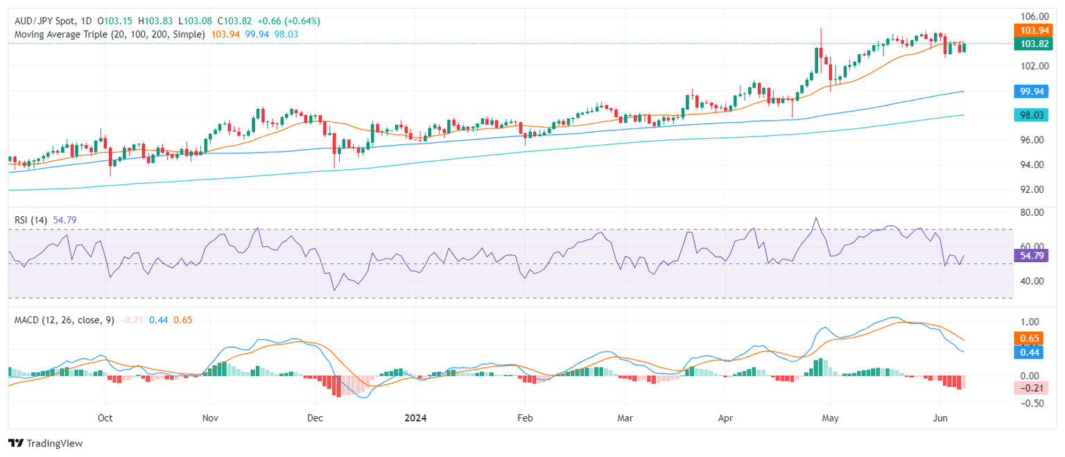 On Monday, the AUD/JPY pair showed signs of stabilizing and rebounded to 103.80, near the 20-day Simple Moving Average (SMA). This could indicate a potential easing of the downward momentum that followed last week's consolidation phase.