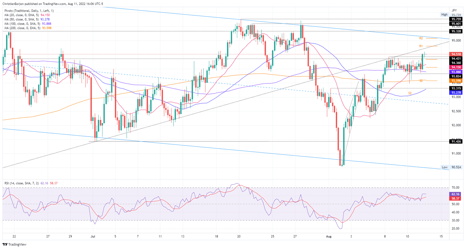 The AUD/JPY snaps two days of losses and advances after Wall Street closed mixed as investors’ upbeat sentiment pauses. Earlier risk appetite improved due to US PPI data, which showed that inflation on the producer’s side is also cooling. So traders asses that the previously-mentioned data, alongside Wednesday’s US CPI, might ease Fed pressures to tackle inflation, meaning a less aggressive tightening. At the time of writing, the AUD/JPY is trading at 94.53, up 0.47%.