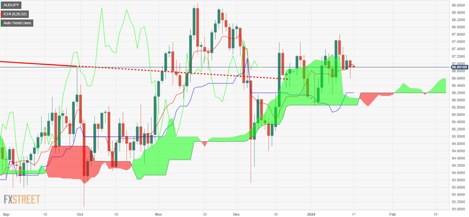 - Technical analysis: AUD/JPY has an upward bias but faces resistance near 97.00/10; breach could lead to more gains.